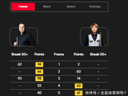 随后的第四局和第五局,徐想又连胜两局,3-2反超雷维斯并取得赛点。其中第四局,徐想轰出单杆满分147分,而这杆满分147分,亦然徐想个东谈主行状生存的第三杆满分147分。