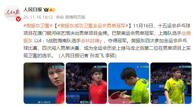 11月16日,十五运会乒乓球名目在澳门星河综艺馆决出男单名目金牌。巴黎奥运会男单冠军、上海队选手樊振东以4∶1降服海南队选手林诗栋 ,夺得冠军。樊振东四次插足全运会乒乓球比赛全讯体育站体育信息,四次闯入男单决赛,成为全运会历史上继马龙之后第二位在男单名目上杀青卫冕的选手。(东谈主民日报记者 孙龙飞 李硕)
