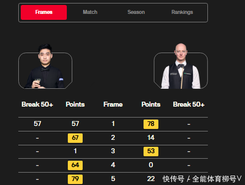 这场比赛,斯佳辉单杆70分开局,在敌手2-1反超比分后,他打出四杆50+,连扳四局以后以6-2淘汰这位世锦赛冠军。比赛前六局,斯佳辉一波攻势取得4-2的跳跃上风。