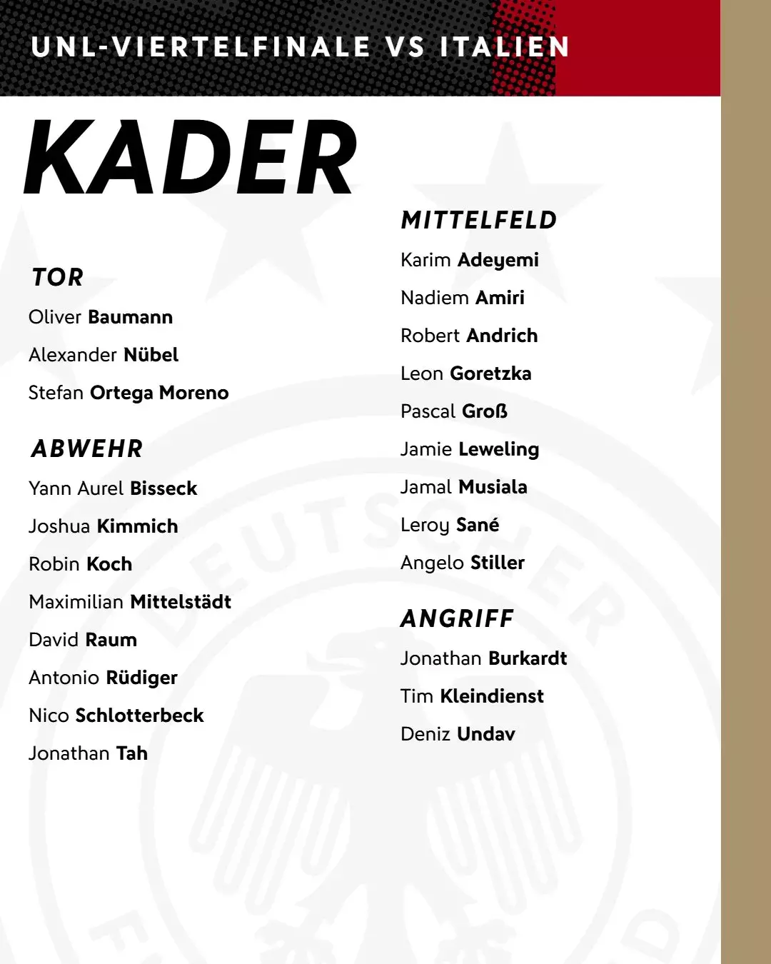 德国足协官方公布了3月国外比赛日大名单,穆夏拉领衔,萨内在列,格雷茨卡回来,比塞克首度入选。