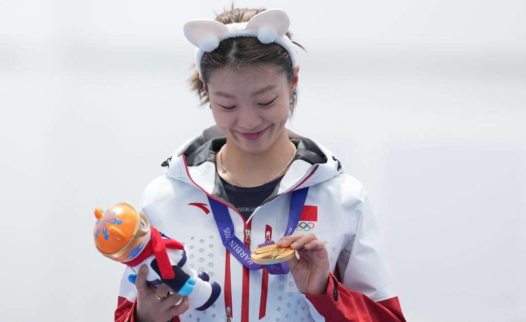 2月11日,冠军中国队选手杨滨瑜在哈尔滨亚冬会速率溜冰女子团体追赶授奖庆典上端量金牌。 新华社记者 李一博 摄