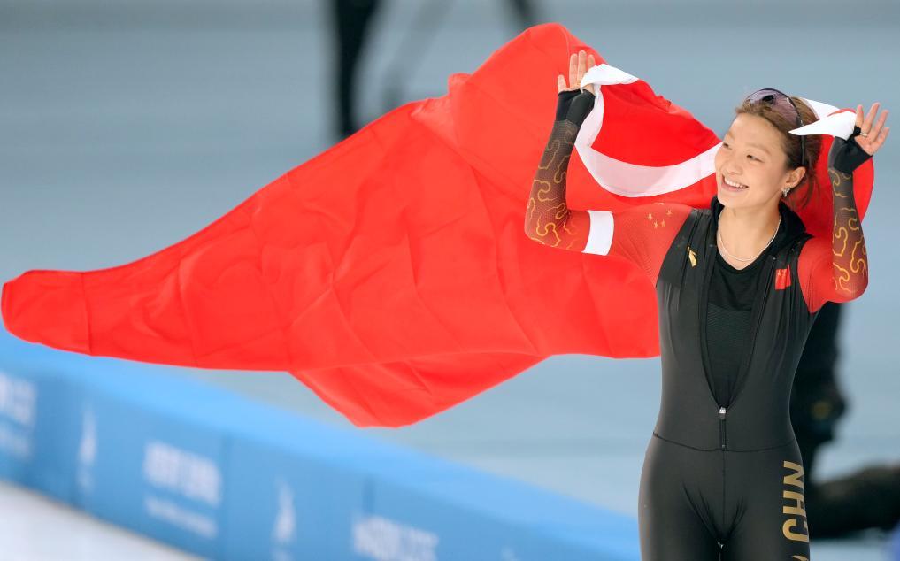 2月10日,杨滨瑜在哈尔滨亚冬会速率溜冰女子3000米决赛夺冠后庆祝。新华社记者 王建威 摄